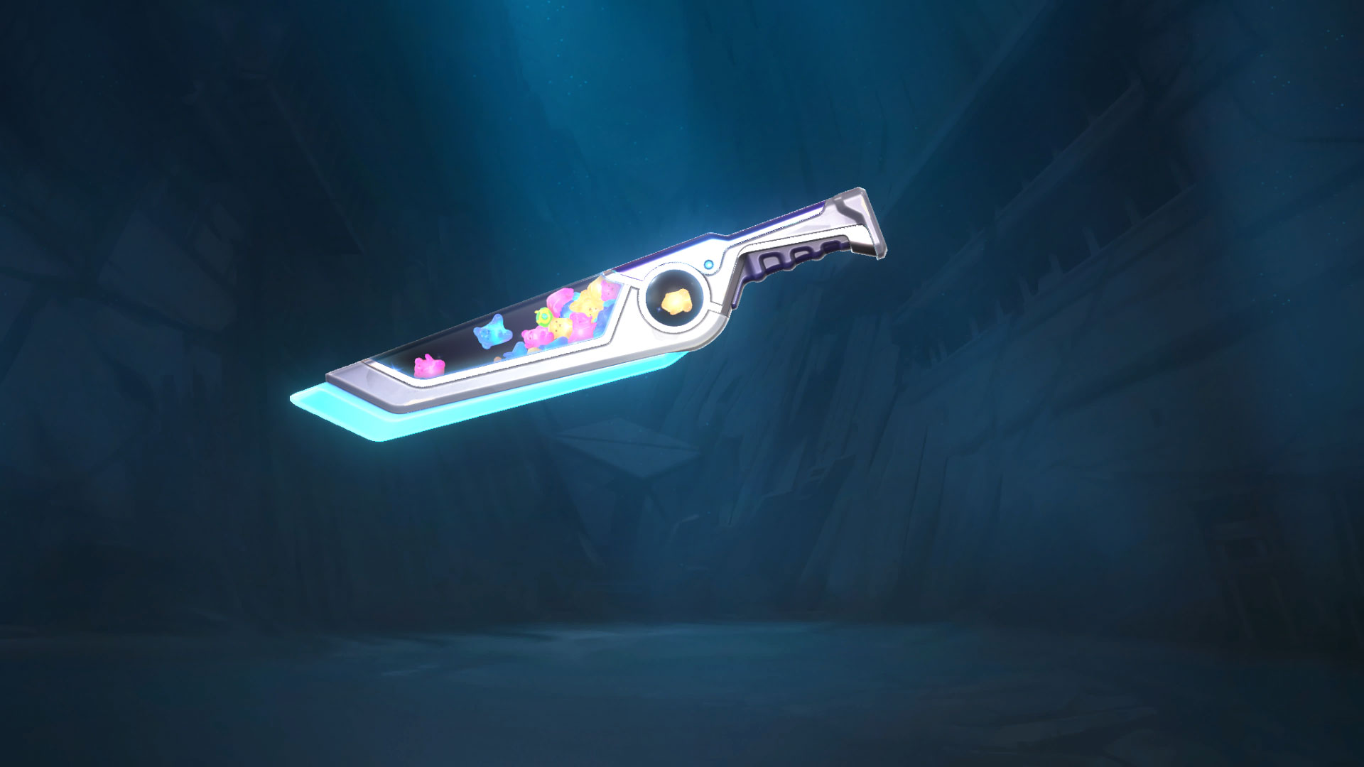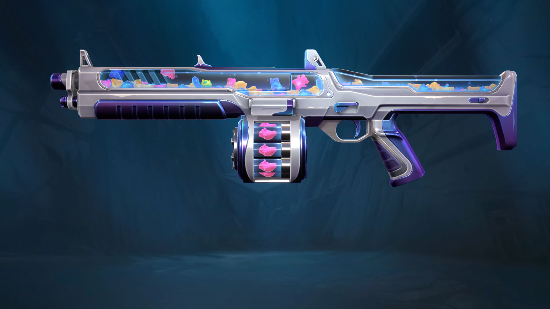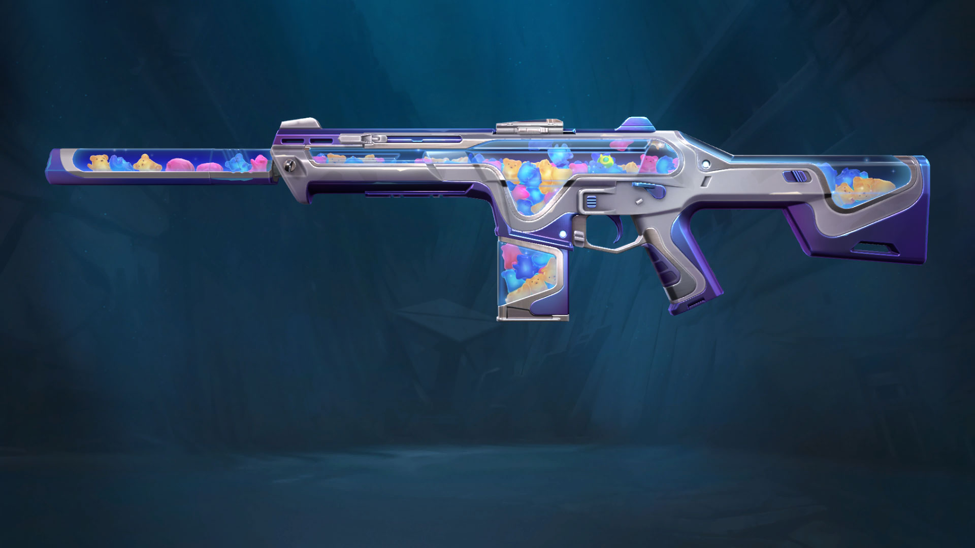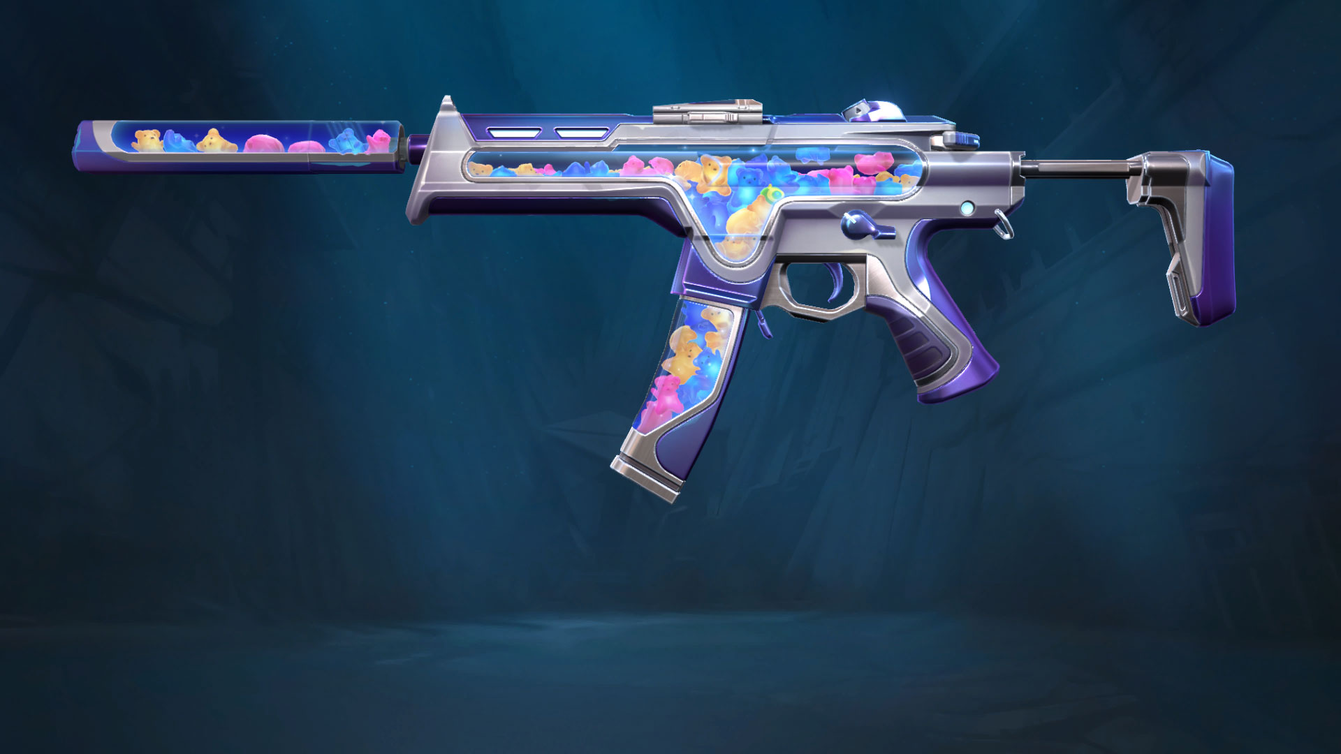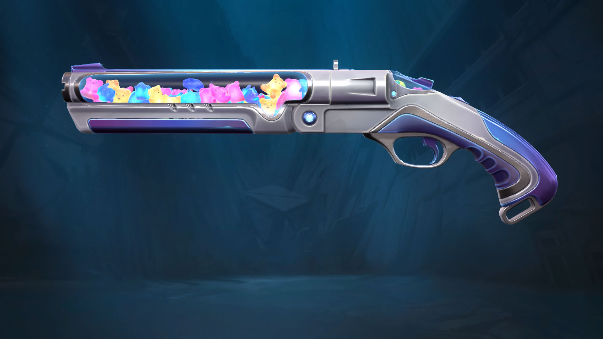 The new Jellybeam skins have come to the store. This is a happy set with a gummy bear filling. The weapons included in this bundle are the Shorty, Spectre, Judge, Phantom and Sugarslice melee blade. The weapons are coloured in silver and blue with purple grips. There aren’t any special animations or SFX, but the multicoloured gummy bears are 3D and you can enjoy watching them float around like a lava lamp.